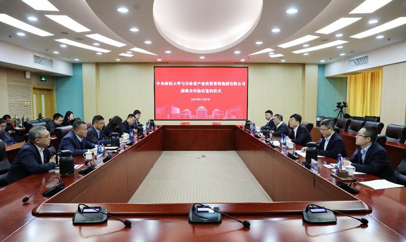 12月9日上午,中央财经大学与吉林省产业投资管理集团有限公司(以下简称“吉林产投管理集团”)战略合作协议签约仪式在学院南路校区举行。吉林产投管理集团党委书记、董事长田志龙,党委专职副书记刘宁,党委委员、副总经理赵鹏,学校党委书记吴国生,党委副书记杨莹出席活动,签约仪式由校长助理、金融学院院长张学勇主持。