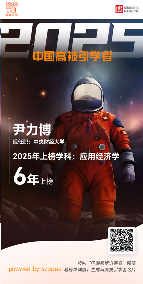 1月30日,国际知名学术出版集团爱思唯尔(Elsevier)正式揭晓 2025 “中国高被引学者”(Highly Cited Chinese Researchers)榜单。我院尹力博教授凭借在应用经济学领域的深厚积淀与卓越成果,成功入选该学科榜单,且实现连续六年蝉联此项荣誉,彰显其学术影响力持续获得全球学界的高度认可。