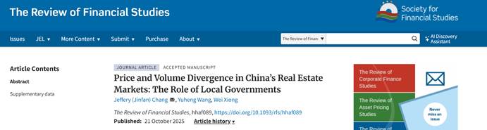 近期,中央财经大学金融学院助理教授王昱衡作为共同第一作者,与香港中文大学(深圳)副教授张劲帆、美国普林斯顿大学教授熊伟合作撰写的论文“Price and Volume Divergence in China’s Real Estate Markets: The Role of Local Governments”被金融学国际 Top3 期刊Review of Financial Studies (UTD24)接收待刊并在线发表。该研究以中国房地产市场在新冠疫情期间的异常表现为切入点,系统分析了地方政府在房地产价格形成中的关键作用。