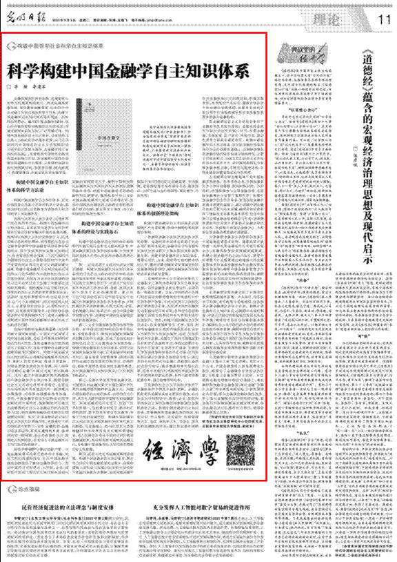 9月9日,《光明日报》理论版刊发我院李健教授以及副校长李建军教授题为《科学构建中国金融学自主知识体系》的署名文章。文章阐述了构建中国金融学自主知识体系的四梁八柱,包括其必要性、科学方法论、理论与实践基石以及创新理论架构。