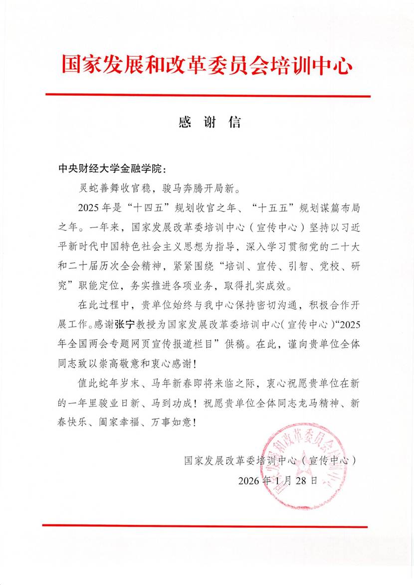近日,我院收到收到国家发展和改革委员会培训中心(宣传中心)的感谢信。感谢信中,特别感谢了我中心成员张宁教授为报道栏目供稿,分析宏观经济相关问题。